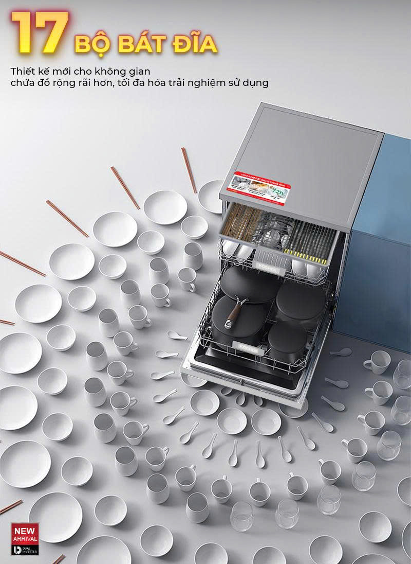 - Dung tích 17 bộ – 3 giàn rửa full-size tối ưu