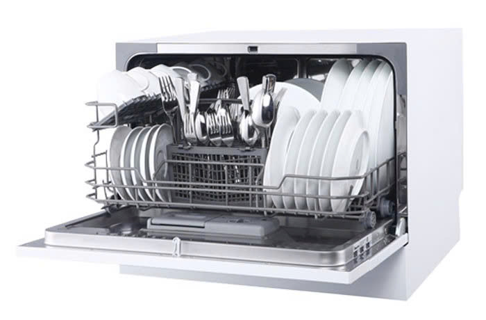 Bên trong máy được bố trí khoa học và tiện lợi: gồm 1 giàn rửa chính và 1 giỏ đựng dao, thìa, đũa. Ngăn chứa có thể xếp đủ 6 bộ bát đĩa tiêu chuẩn, thậm chí xếp được thêm một vài nồi chảo nhỏ – đáp ứng nhu cầu rửa chén bát hàng ngày của gia đình ít người. Chất liệu khoang rửa bằng hợp kim không gỉ sáng bóng giúp dễ vệ sinh và bền bỉ với thời gian. Cánh cửa máy mở phía trước với bảng điều khiển cảm ứng gắn ngay mặt trước, thuận tiện cho thao tác và theo dõi trạng thái rửa.