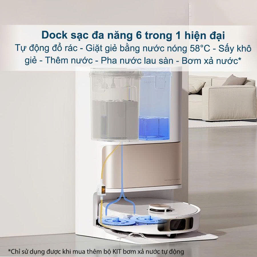 Tự châm nước sạch và dung dịch lau sàn để robot luôn sẵn sàng sử dụng. Bạn có thể chọn kết nối trực tiếp với đường nước (bộ kit tùy chọn) để không phải tiếp nước thủ công.