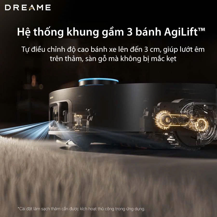Hệ thống Triple‑Wheel AgiLift™ gồm hai bánh truyền động chính và một bánh xoay đa hướng. Mỗi bánh hoạt động độc lập và có khả năng nâng hạ lên tới 3 cm, giúp robot thích nghi với các bề mặt khác nhau như gỗ, gạch men, đá tự nhiên và thảm. Cơ chế này đảm bảo robot luôn giữ thăng bằng và duy trì lực hút ổn định khi đi qua các đoạn chuyển tiếp giữa sàn cứng và thảm.