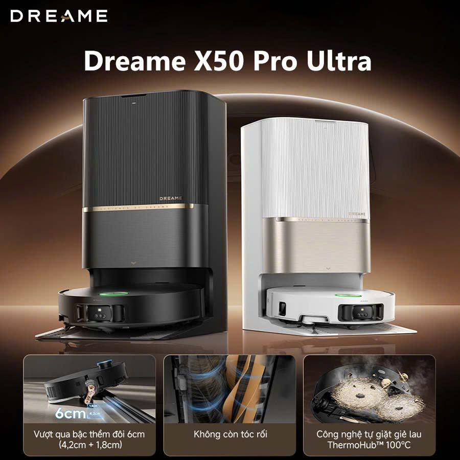 Dreame X50 Pro Ultra là lựa chọn phù hợp cho gia đình hiện đại có nhiều loại sàn và cần một giải pháp dọn dẹp gần như rảnh tay. Lực hút 30 000 Pa kết hợp chổi kép chống rối giúp robot xử lý tốt bụi mịn, tóc và lông thú. Công nghệ lau Omni‑Scrub cùng nước ấm 40 °C mang tới bề mặt sạch sâu, khô nhanh. ProLeap vượt gờ 6 cm cùng VersaLift cho phép robot chinh phục cả bậc thềm và gầm thấp. Dock PowerDock™ tự động xả bụi, giặt sấy giẻ bằng nước nóng 100 °C và sấy 50 °C, đồng thời quản lý nước sạch/bẩn, mang lại trải nghiệm gần như không cần can thiệp. Với pin 6 400 mAh và trí tuệ nhân tạo nhận diện 240 vật thể, X50 Pro Ultra xứng đáng là “lá cờ đầu” trong thế giới robot hút bụi lau nhà.