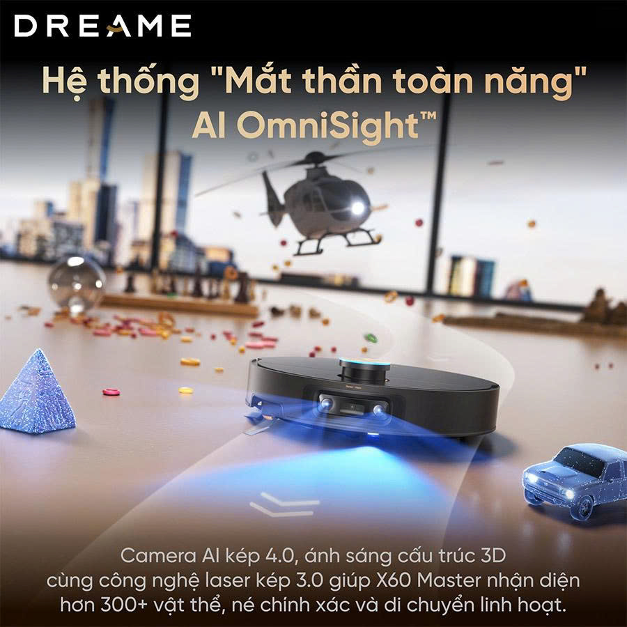 Điểm nổi bật của X60 Master là hệ thống AI kép kết hợp 2 camera góc rộng và cảm biến cấu trúc 3D. Thiết bị có thể nhận diện hơn 300 loại vật thể như dây điện, đồ chơi, bát đĩa… và phản hồi chỉ trong 0,1 giây. Nhờ đó robot di chuyển mượt mà, tránh va chạm và hạn chế kẹt. Đèn LED tích hợp giúp robot phát hiện bụi mịn, lông thú cưng hoặc chất lỏng trong suốt, từ đó tự điều chỉnh lực hút, giảm tốc độ chổi cạnh hoặc lau lại nhiều lần tại khu vực bẩn.