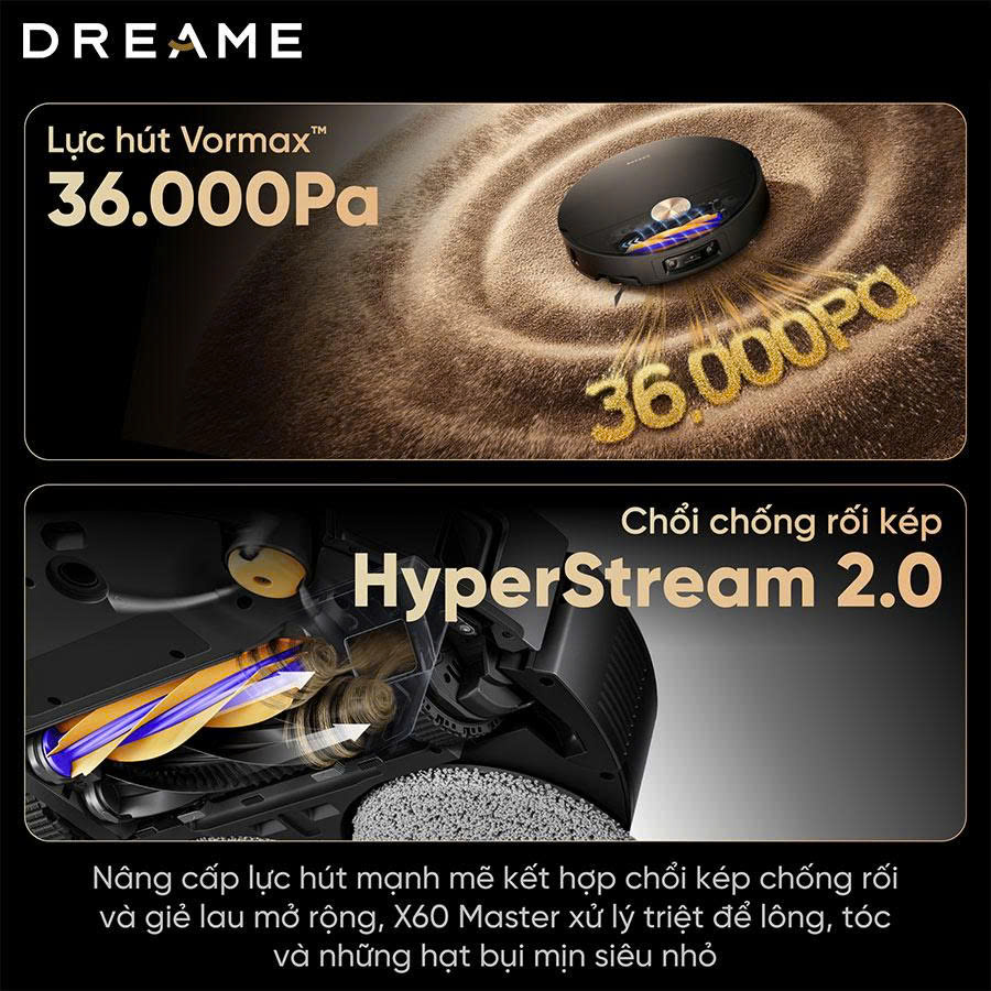 Một trong những tiêu chí quan trọng khi mua robot hút bụi là lực hút. X60 Master trang bị động cơ Vormax mạnh mẽ với lực hút tối đa 36 000 Pa, có thể đánh bật bụi bẩn cứng đầu trên sàn cứng và thảm. Hệ thống chổi kép HyperStream 2.0 chống rối, giúp xử lý tóc và lông thú dài tới 40 cm mà không bị quấn. Kết hợp với túi bụi 3,2 L tại trạm sạc, robot có thể lưu trữ rác trong khoảng 100 ngày trước khi cần thay túi.