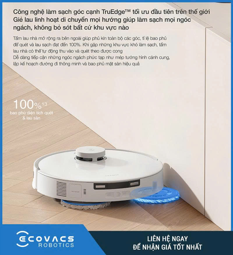 Nhờ công nghệ này, Deebot T30e Pro Omni được mệnh danh là robot “không góc chết” bởi khả năng vệ sinh mép tường gần như tuyệt đối..