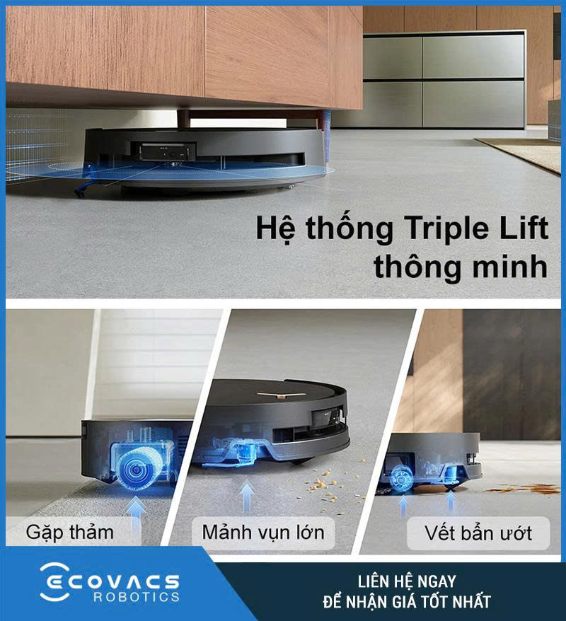 Hệ thống Triple Lift đóng vai trò quan trọng khi robot hoạt động trên sàn hỗn hợp. Cảm biến phát hiện bề mặt giúp robot nhận diện sàn gỗ, gạch hoặc thảm và điều chỉnh chế độ phù hợp. Khi gặp thảm, cụm lau nâng lên 15 mm để tránh ướt, trong khi khăn lau vẫn giữ áp lực 6 N trên sàn cứng để chà sạch vết bẩn. Sau khi lau ướt xong, robot sẽ tự nâng nhẹ cụm lau và quay một vòng hút để làm khô bề mặt, chống trơn trượt. Tính năng này bảo vệ thảm, sàn gỗ và cho phép robot làm sạch nhiều khu vực mà không cần tháo lắp giẻ thủ công.