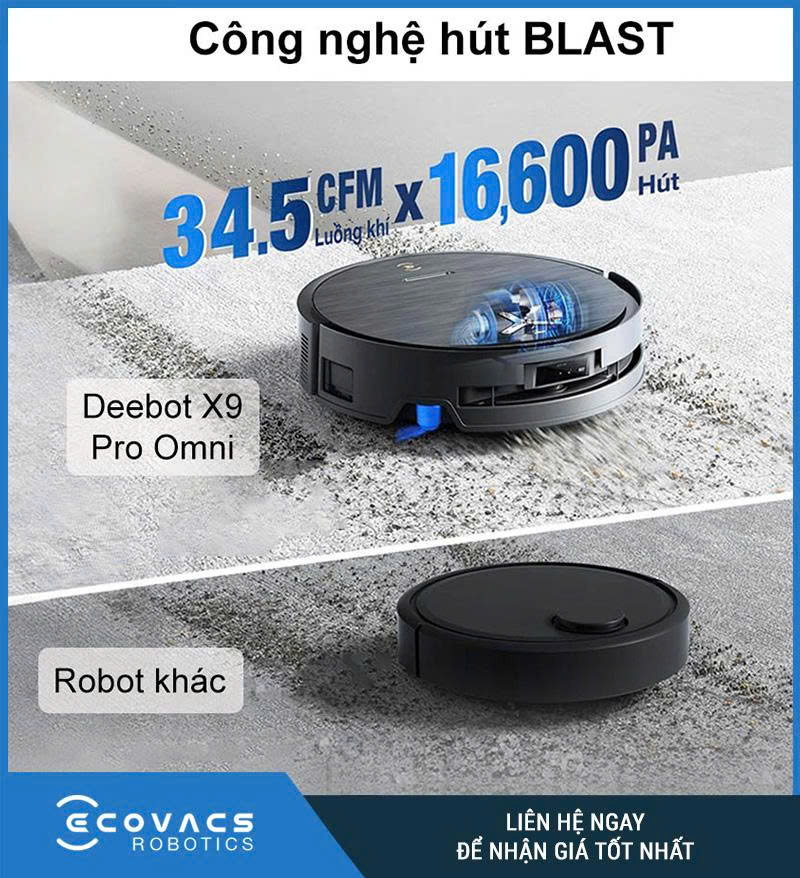 Một trong những điểm thuyết phục của robot hút bụi lau nhà roborock Ecovacs‑Deebot X9 Pro là công nghệ BLAST (Blast Airflow) với lực hút cực đại 16 600 Pa. Khả năng hút bụi mạnh giúp robot dễ dàng xử lý tóc rụng, lông thú cưng, vụn thức ăn và cả các mảnh vụn nhỏ nằm sâu trong khe thảm. Cảm biến thông minh tự nhận diện chất liệu sàn (gạch, gỗ, thảm …), tự động tăng hoặc giảm lực hút phù hợp để vừa tiết kiệm pin, vừa tránh mài mòn mặt sàn gỗ. Động cơ không chổi than cao cấp hoạt động êm ái, giúp độ ồn khi hút thấp hơn 65 dB, phù hợp với không gian có trẻ nhỏ hoặc người làm việc tại nhà.