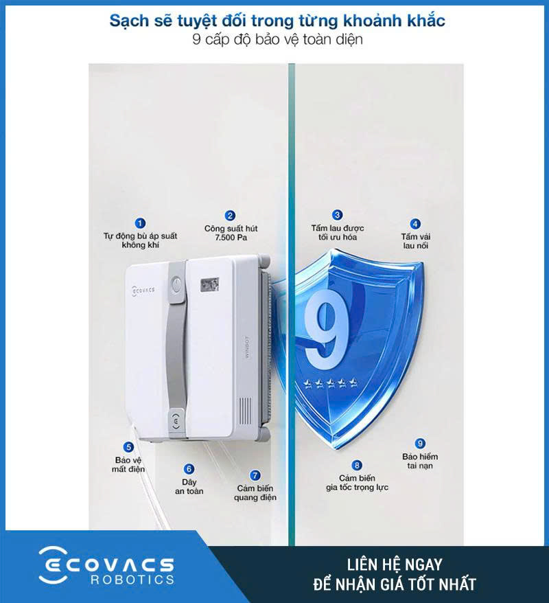 Hệ thống cảm biến nhận biết mép kính và chống rơi đa tầng giúp robot luôn bám chắc vào bề mặt. Khi phát hiện nguy cơ mất áp suất, robot sẽ tự dừng và phát cảnh báo bằng giọng nói, đồng thời dây an toàn bảo vệ thêm một lớp. Nhà sản xuất còn trang bị 9 mức bảo vệ với 6 giai đoạn chống rơi, 2 lớp bảo vệ phần mềm và chế độ bảo hiểm hỏng hóc giúp bạn yên tâm sử dụng.