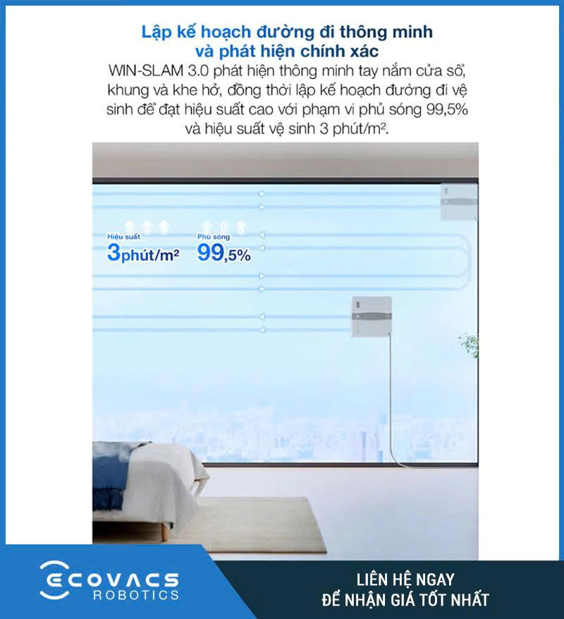 Một trong những điểm đáng giá của Robot lau kính Ecovacs‑Winbot‑Mini là thuật toán lập kế hoạch đường đi WIN‑SLAM 3.0. Công nghệ này giúp robot nhận biết kích thước khung cửa, tính toán đường di chuyển tối ưu và tránh chướng ngại vật cao tới 50 mm. Nhờ đó, robot có thể làm việc hiệu quả trên cả khung kính có viền lẫn kính không viền, tiếp cận mép kính mà không bị trượt ra ngoài.