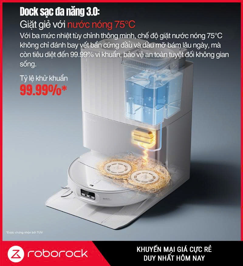 - Nước nóng 75 °C, diệt khuẩn 99,99 %: Dock sạc Revo Station 3.0 rửa giẻ bằng nước nóng 75 °C và sấy khô bằng khí ấm 45 °C, giúp khử khuẩn, loại bỏ mùi hôi và sẵn sàng cho lần sử dụng tiếp theo.