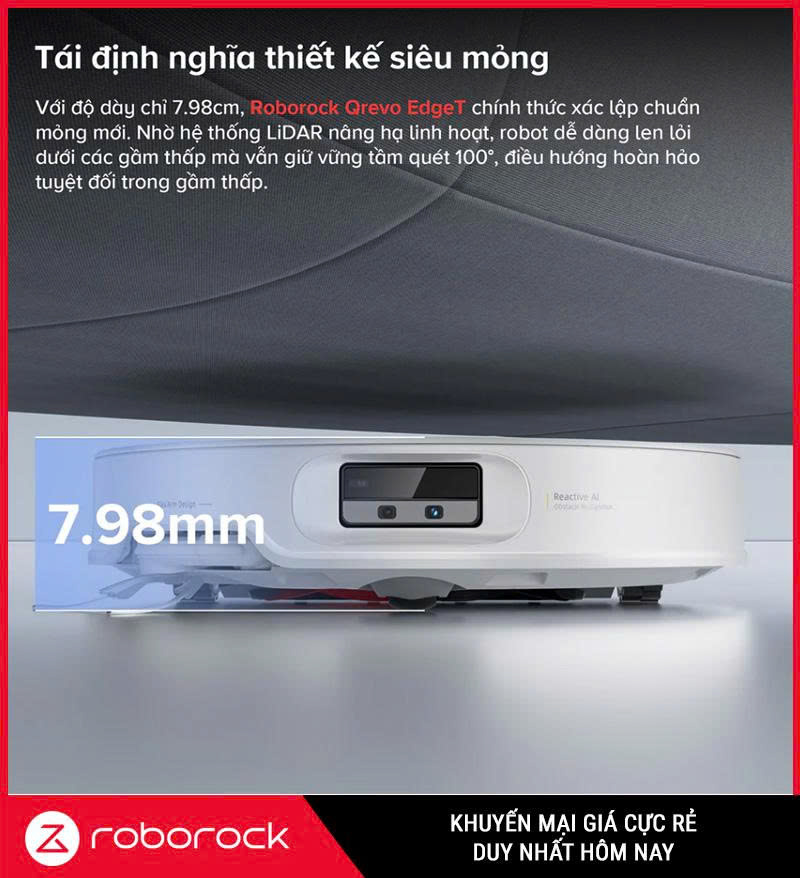 - Chiều cao mỏng 9,8 cm: Nhờ thiết kế mỏng chỉ khoảng 9,8 cm, máy có thể luồn vào gầm giường, dưới bàn hoặc sofa – những nơi robot thông thường khó tiếp cận.