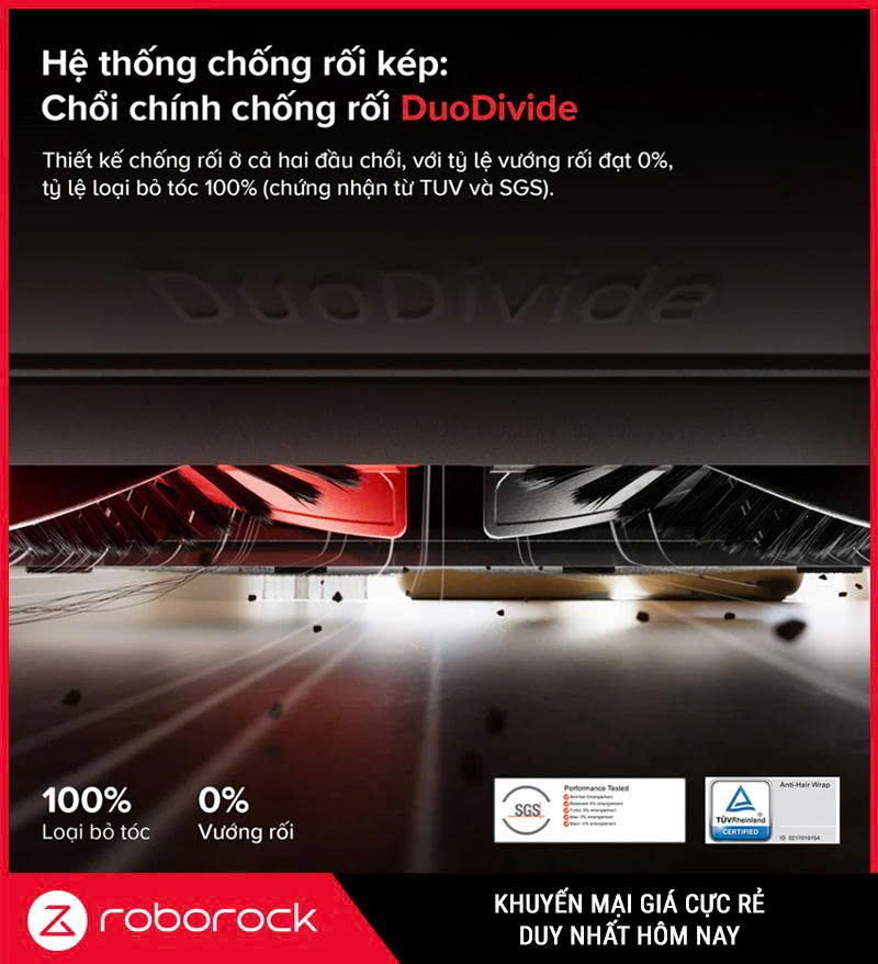 - DuoDivide™ Main Brush: Đây là hệ thống chổi kép với hai lô chổi ngắn song song, các rãnh xoắn đưa tóc vào khe giữa để hút sạch, đạt tỷ lệ chống rối gần như 0 %.