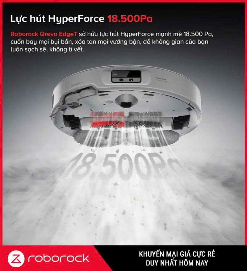 - Sức hút 18.500 Pa: Với công nghệ HyperForce, robot hút bụi roborock Q Revo EdgeT tạo lực hút khủng, hút sạch bụi mịn, lông thú và các mảnh vụn lớn chỉ trong một lượt đi. Đây là mức công suất hàng đầu trong phân khúc, tương đương các sản phẩm cao cấp trên thị trường.
