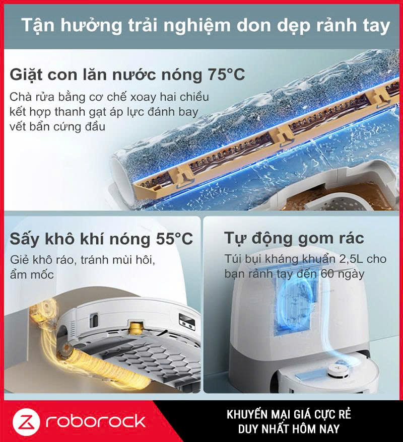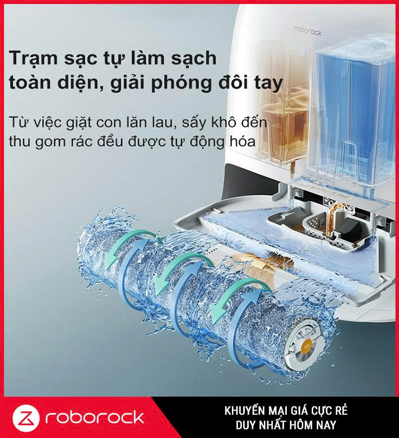 - Tự động hóa toàn diện – robot tự đổ rác, tự giặt – sấy – làm sạch, kết nối điều khiển qua app Roborock, hỗ trợ Google Home và Alexa tiện lợi.