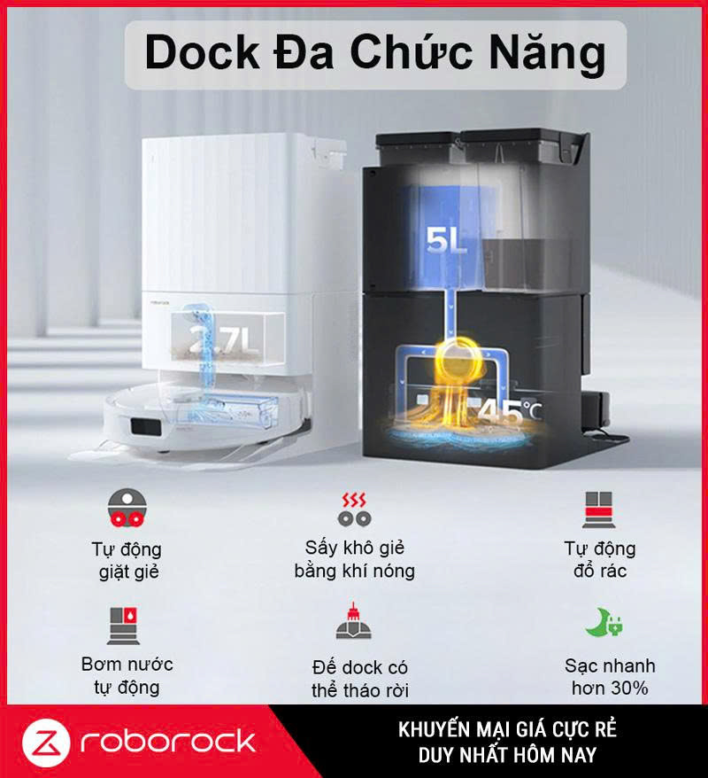 - Trạm đa năng 5-in-1 tự động hoàn toàn – Tự giặt, sấy nóng 45°C, bơm nước, đổ rác và sạc nhanh hơn 30%, giúp bạn rảnh tay hàng tuần.