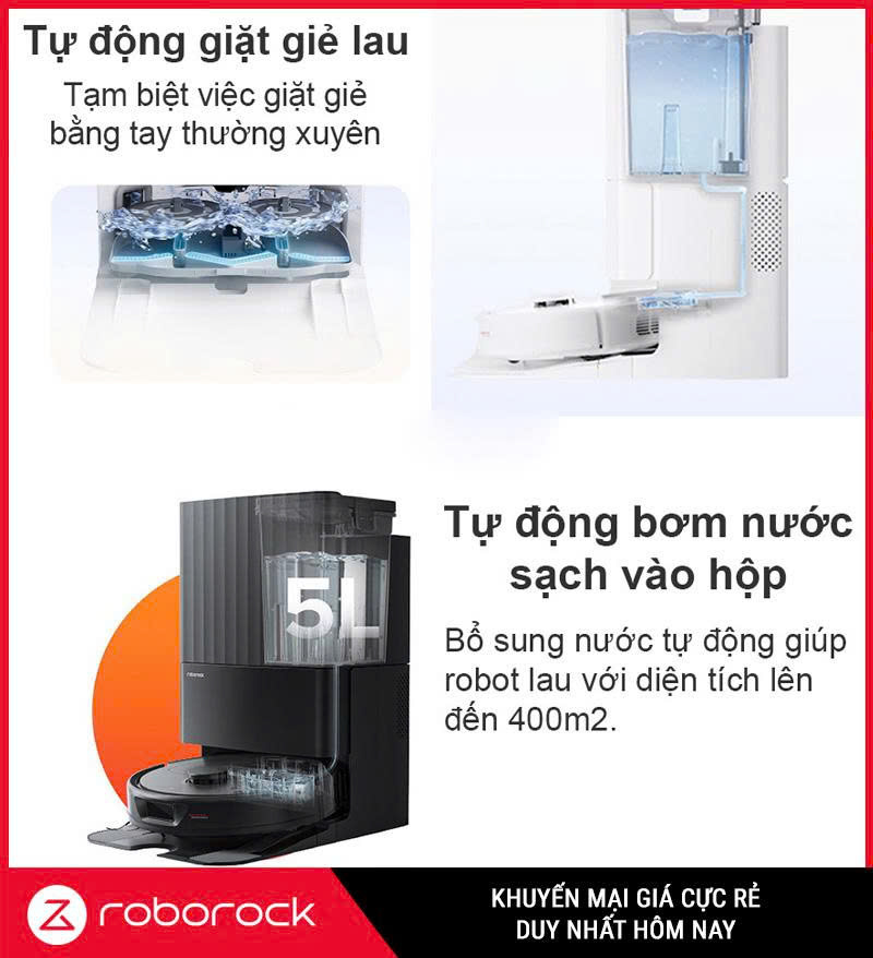 - Giẻ lau tự giặt như thế nào? Sau khi kết thúc chu trình lau, robot quay về dock. Đế sạc dùng nước sạch trong bình 5 lít rửa sạch giẻ và bơm nước mới vào hộp chứa để chuẩn bị cho lần lau tiếp theo.. Bạn không cần chạm tay vào giẻ bẩn.