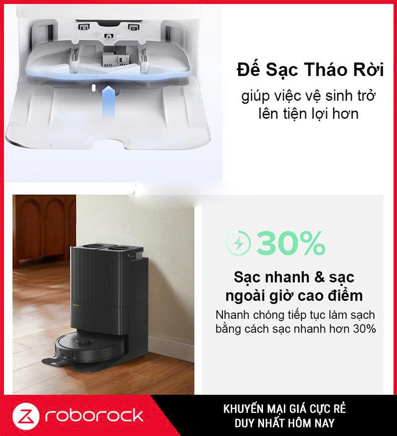 Bản thân đế sạc có thiết kế tháo rời dễ vệ sinh.. Công nghệ sạc nhanh giúp robot nạp đầy pin nhanh hơn 30 % so với thế hệ trước., luôn sẵn sàng cho lần làm sạch tiếp theo. Đế cũng tích hợp hệ thống tự đổ rác với túi chứa 2,7 lít, đủ dùng khoảng bảy tuần mới phải thay..
