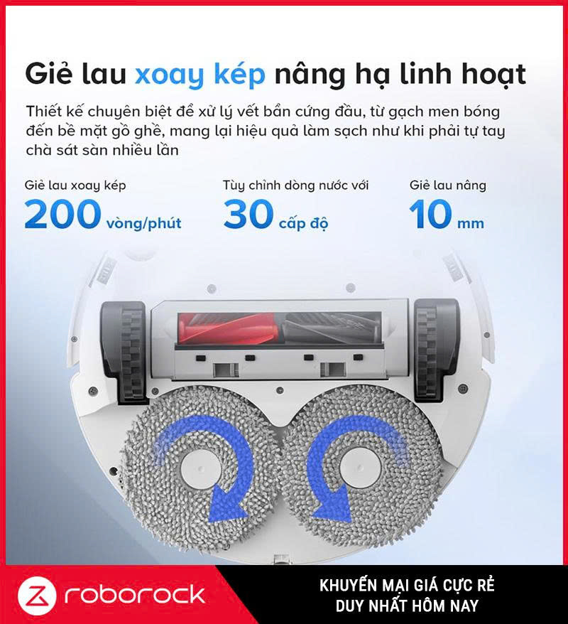 - Giẻ lau xoay kép tự nâng hạ thông minh – Tốc độ 200 vòng/phút, tự động nâng khi gặp thảm, giữ sàn luôn khô ráo và sạch sâu.