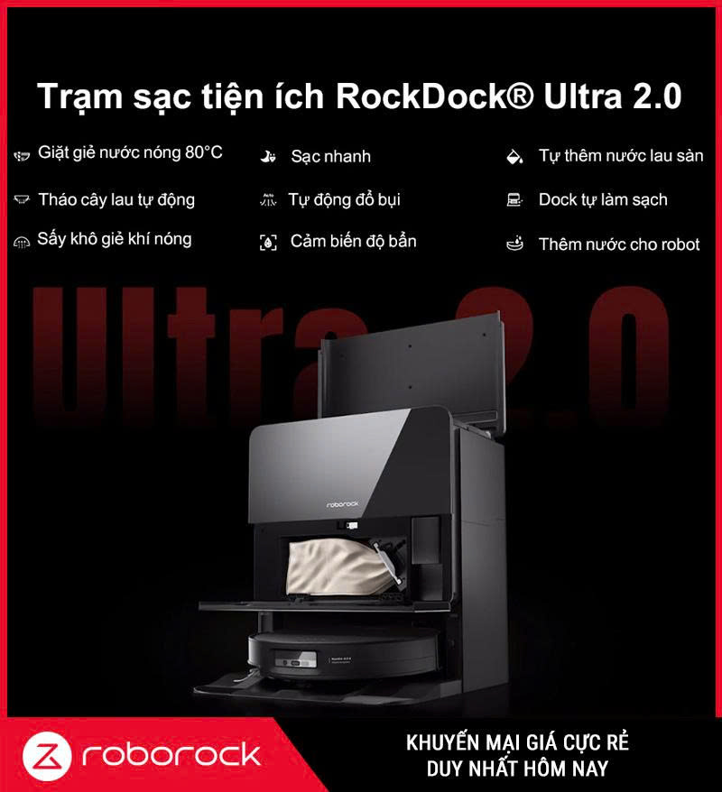 - Trạm RockDock Ultra 2.0 toàn năng – tự hút bụi, giặt và sấy khăn lau bằng nước nóng 80°C, gần như không cần can thiệp thủ công.
