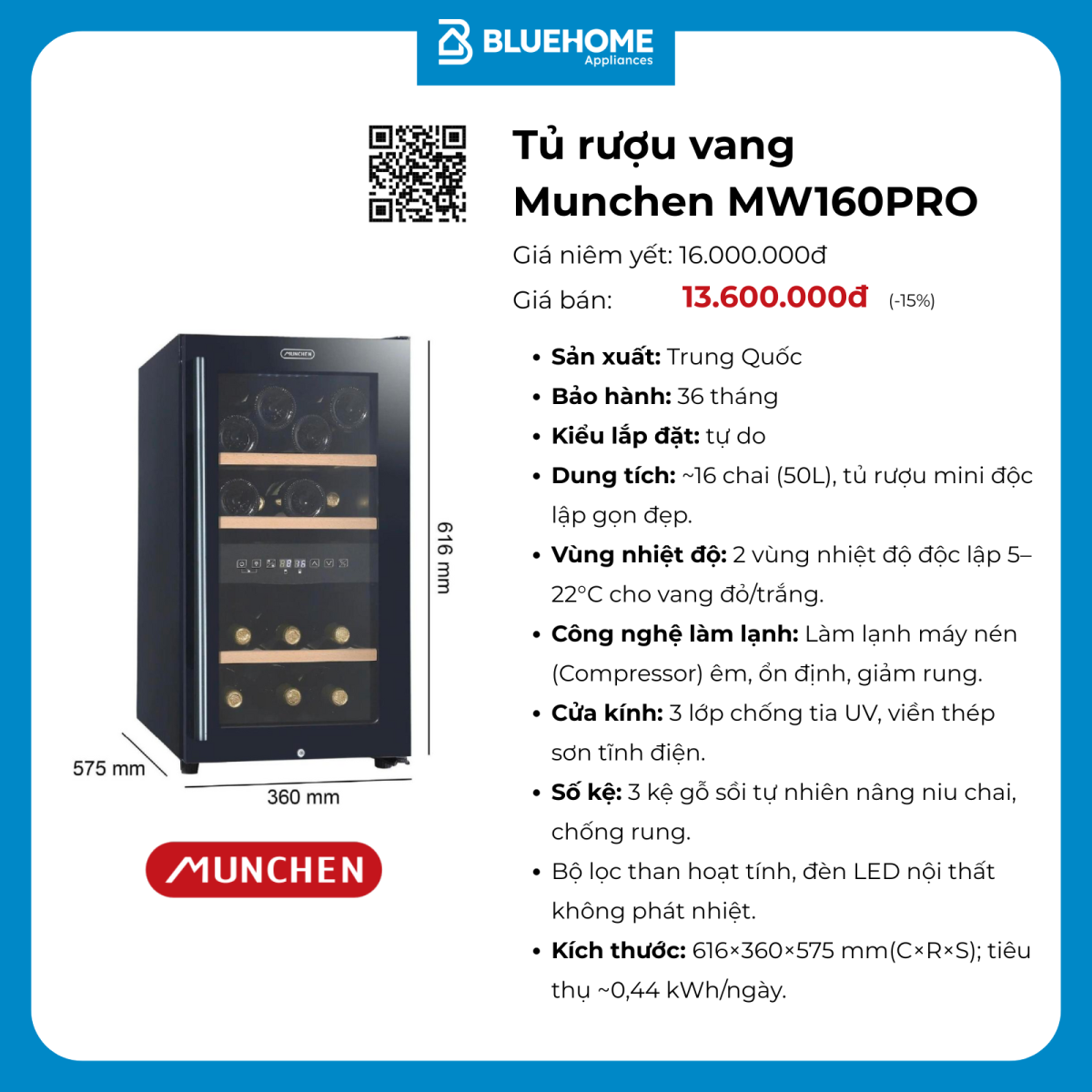 Tủ rượu vang Munchen MW160PRO (~16 chai)