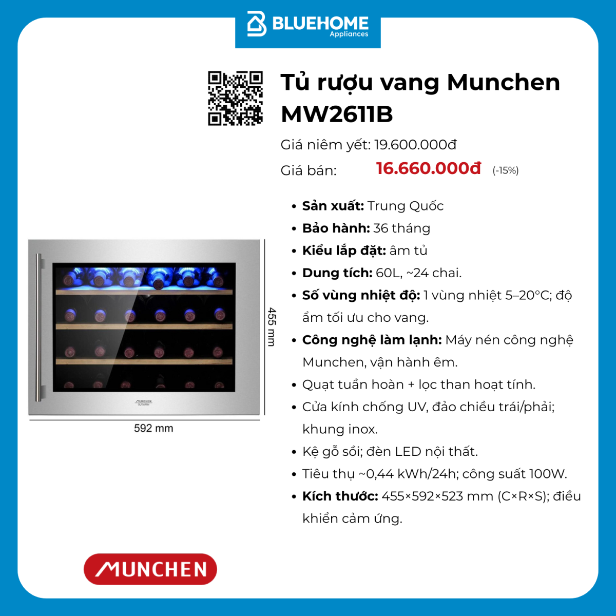 Tủ rượu vang Munchen MW2611B - Giải pháp hoàn hảo để bảo quản rượu vang của bạn