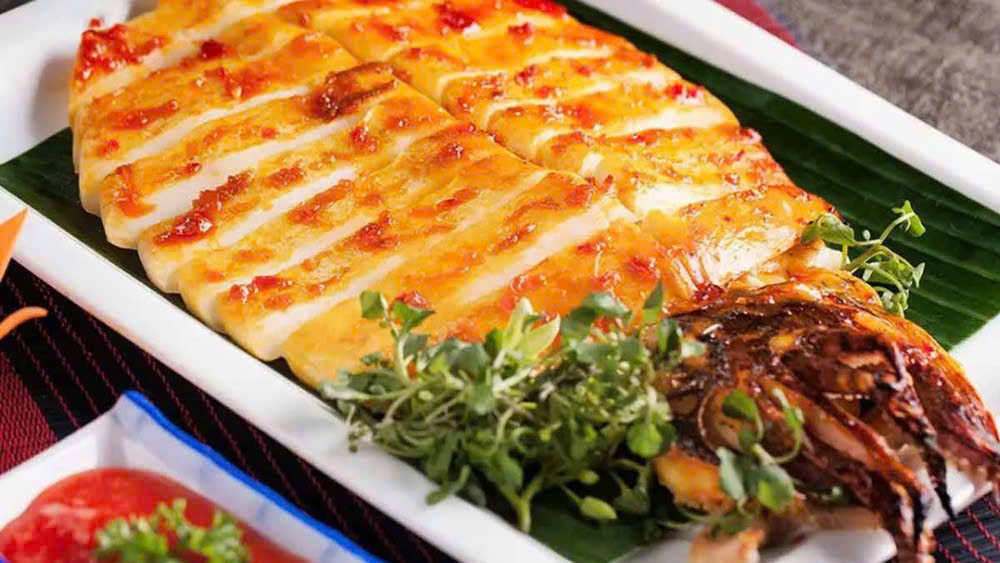 Thưởng thức: Mực tươi nướng nên ăn ngay khi nóng, rắc thêm ít rau thơm (như ngò, rau răm) cho dậy mùi. Món này chấm hợp với muối ớt xanh hoặc tương ớt đều ngon.