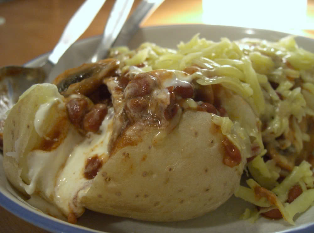 Khoai tây nướng bằng lò vi sóng, sau đó nhồi nhân kem chua, phô mai và đậu – một biến tấu “khoai tây bỏ lò” kiểu phương Tây đơn giản có thể thực hiện với lò vi sóng.