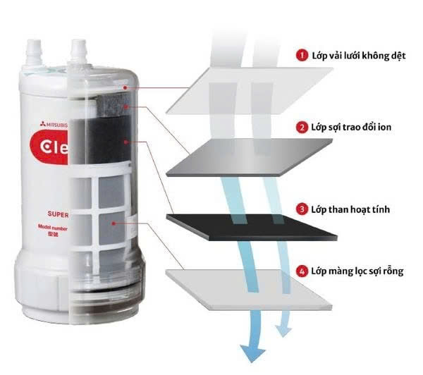 Cấu tạo lõi lọc Cleansui gồm 4 lớp lọc liên tiếp: (1) Vải lưới không dệt loại bỏ cặn bẩn thô; (2) Sợi trao đổi ion khử kim loại nặng như chì; (3) Than hoạt tính hấp phụ clo, hóa chất và mùi hôi; (4) Màng lọc sợi rỗng lọc vi khuẩn và tạp chất siêu nhỏ.