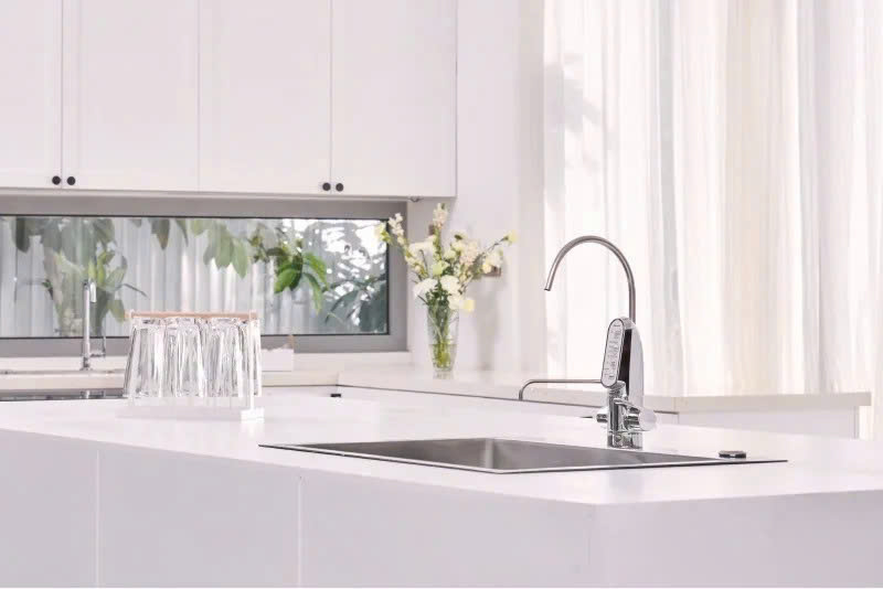Máy lọc nước Mitsubishi Cleansui lắp âm gọn gàng dưới chậu rửa, chỉ lộ vòi nước tinh khiết riêng trên mặt bồn, đảm bảo thẩm mỹ cho gian bếp.