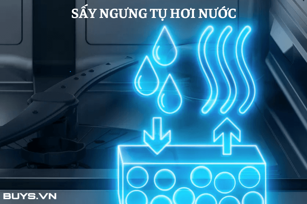 Sấy ngưng tụ (condensation): Là phương pháp phổ biến trên máy rửa bát châu Âu. Máy đốt nước nóng làm bay hơi nước trong khoang, sau đó hơi nước được ngưng tụ lại thành nước qua bề mặt lạnh (hoặc vòi phun nước lạnh), chảy xuống ống xả. Phương pháp này không tiêu thụ nhiều điện cho sấy vì tận dụng nhiệt còn lại; đồng thời hạn chế hơi nước thoát ra môi trường. Tuy nhiên, vì nhiệt độ sấy thấp, bát đĩa (nhất là nhựa) có thể còn hơi ướt nếu không có thêm chất phụ gia hút ẩm. Bosch trang bị thêm hệ trì hoãn mở cửa AutoAir giúp khô thêm, nhưng vẫn lâu khô hơn các máy sấy mạnh.