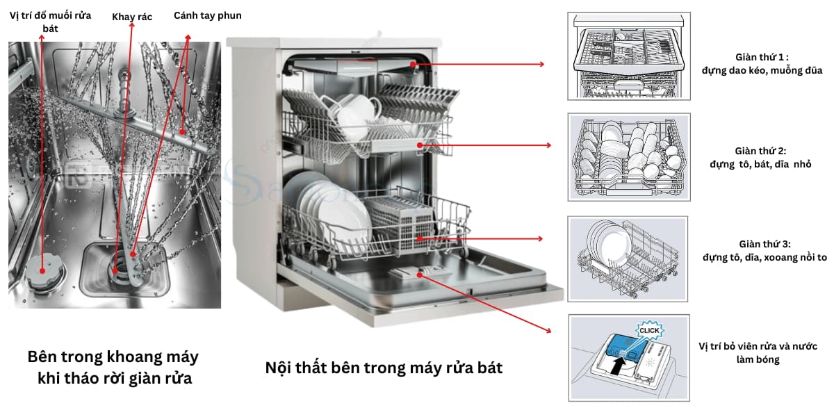 | Khoang rửa & giá đỡ bát đĩa | Không gian bên trong máy để xếp bát đĩa, có các giá (rổ) nhiều tầng bằng thép không gỉ, chịu nhiệt, cách nhiệt. |