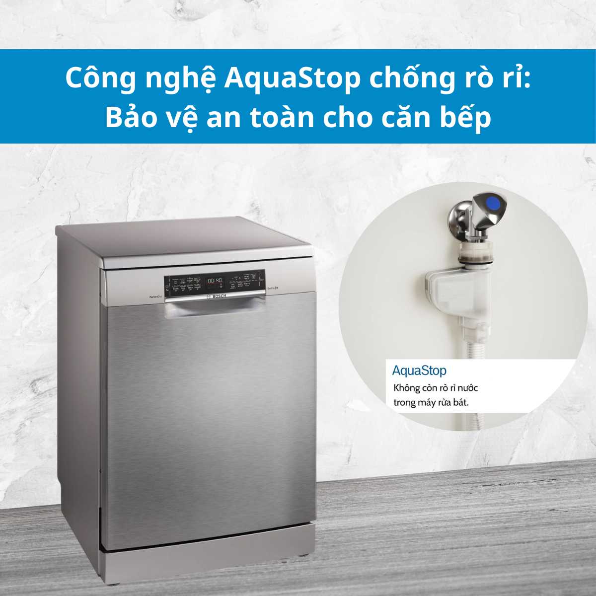 Công nghệ AquaStop chống rò rỉ là một trong những ưu thế nổi bật của máy rửa bát Bosch, thể hiện tầm nhìn tiên phong của Bosch trong việc bảo vệ an toàn cho căn bếp và gia đình người sử dụng. Với cấu tạo thông minh gồm van an toàn, ống dẫn kép và bộ cảm biến, AquaStop mang lại hiệu quả phòng tránh rò rỉ tuyệt vời, giúp tăng độ bền thiết bị và đem lại sự an tâm tối đa. BlueHome khuyến khích bạn chọn mua những mẫu máy rửa bát Bosch trang bị AquaStop để được trải nghiệm đầy đủ công nghệ cao cấp này.