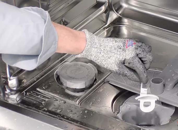 Tháo rời tay phun: Gỡ bỏ cả cánh tay phun ở giàn trên và giàn dưới ra khỏi máy rửa bát.
