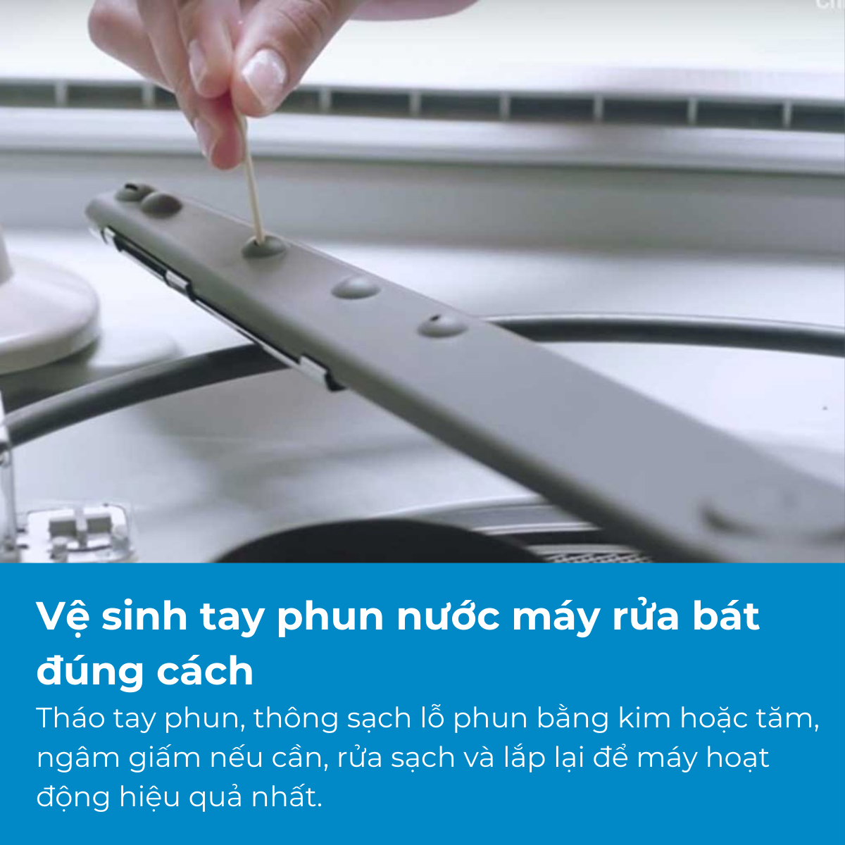 Cánh tay phun nước (tay phun) là bộ phận phân phối nước đến mọi ngóc ngách bên trong khoang máy rửa bát. Để dòng nước luôn mạnh và không bị tắc, tay phun cần được làm sạch định kỳ. Bạn có thể vệ sinh cánh tay phun nước tại nhà theo các bước đơn giản sau: