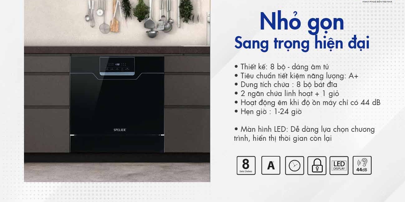 Máy rửa bát 8 bộ là lựa chọn lý tưởng cho gia đình ít người hoặc căn bếp nhỏ. Với kích thước nhỏ gọn (cao ~60 cm, rộng ~55 cm, sâu ~50 cm) và khả năng lắp đặt linh hoạt (độc lập hoặc âm tủ), máy 8 bộ đáp ứng tốt nhu cầu rửa bát đĩa hàng ngày mà không chiếm nhiều diện tích. Bạn sẽ tiết kiệm được không gian bếp và chi phí đầu tư ban đầu, đồng thời tận hưởng sự tiện nghi khi không còn phải rửa chén bát bằng tay.