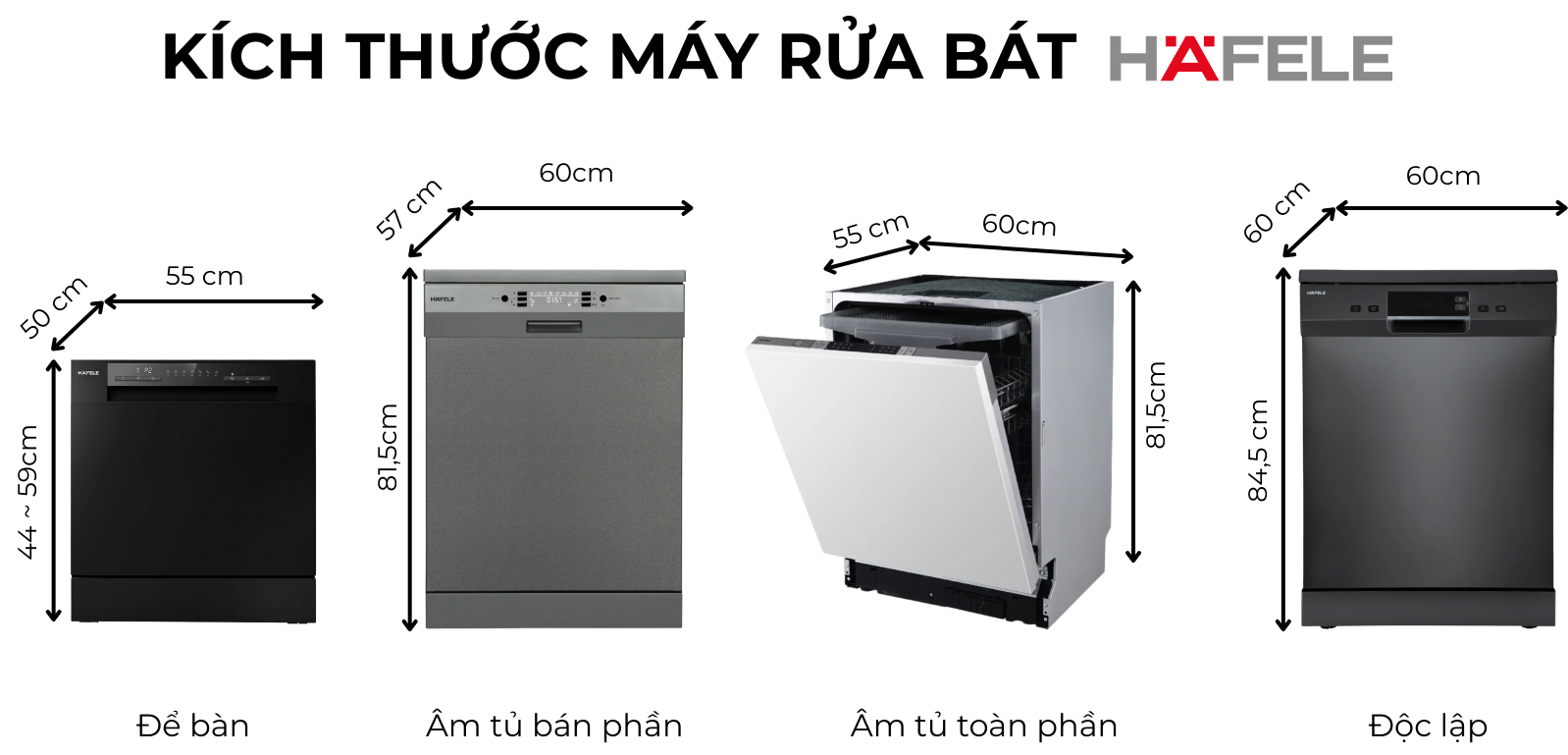 Trên thị trường hiện nay, máy rửa bát Hafele có thể được chia thành ba loại chính theo kiểu dáng và cách lắp đặt: máy để bàn (mini), máy độc lập và máy âm tủ (ngoài ra còn có dòng bán âm tủ ít phổ biến hơn). Mỗi loại máy có kích thước tiêu chuẩn riêng, phù hợp với nhu cầu sử dụng và diện tích bếp khác nhau. Dưới đây là bảng kích thước tham khảo cho các dòng máy rửa bát Hafele thông dụng hiện nay:
