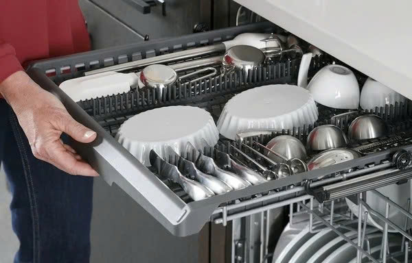 Bên trong một máy rửa bát ba tầng khay. Khay thứ ba (trên cùng) chứa được nhiều loại vật dụng nhỏ: từ đũa thìa, muôi vá cho đến tách cà phê, bát con. Nhờ sắp xếp riêng lẻ, chúng sẽ được rửa sạch kỹ và không còn “va chạm” vào nhau như khi xếp chung giỏ.