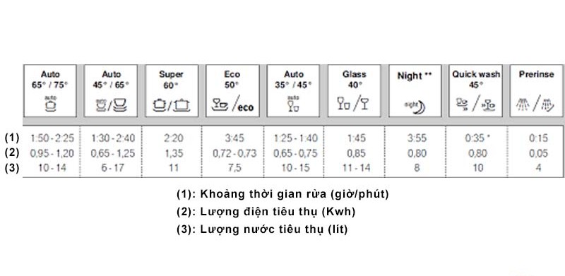 (Hình ảnh tham khảo: mức tiêu thụ điện nước trung bình của từng chương trình rửa)