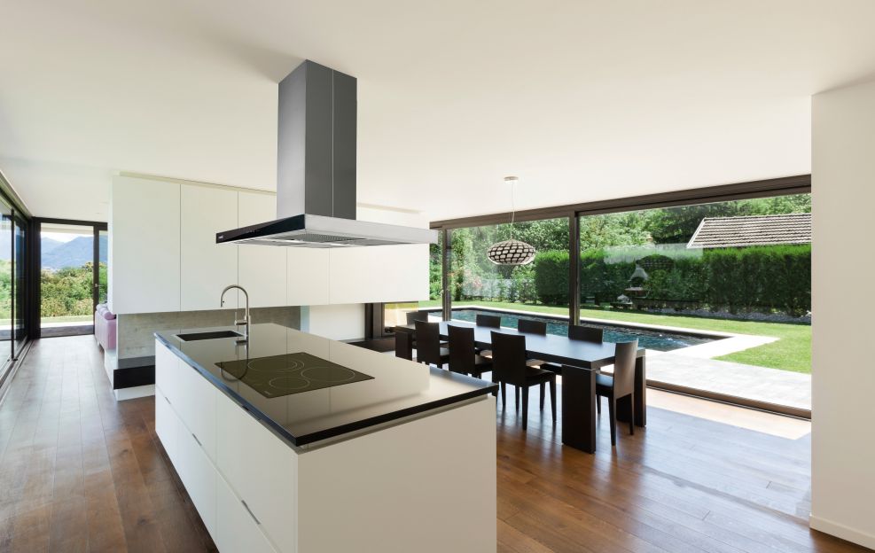 Không gian mở, đảo bếp làm trung tâm: Trong các ngôi nhà hiện đại, bếp thường thiết kế mở thông với phòng khách. Đảo bếp khi đó đóng vai trò ngăn cách tự nhiên giữa bếp và phòng khách, đồng thời là điểm nhấn thu hút. Xu hướng này đi kèm hệ thống hút mùi âm trần mạnh mẽ để đảm bảo mùi thức ăn không lan sang không gian sinh hoạt chung.