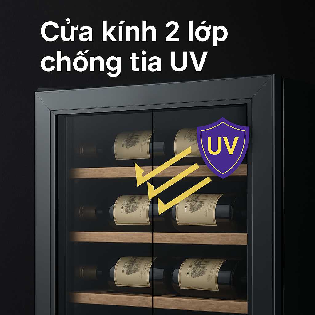Như vậy, cửa kính 2 lớp phủ UV đóng vai trò như “chiếc lá chắn kép”: vừa chống tia tử ngoại, vừa cách nhiệt. Đây là tiêu chí quan trọng khi lựa chọn tủ bảo quản rượu vang cao cấp. Nhiều thương hiệu tủ rượu hiện đại (như Munchen, Bosch, Malloca…) đã ứng dụng kính hai lớp chống tia UV để đảm bảo mỗi chai rượu được bảo vệ toàn diện.
