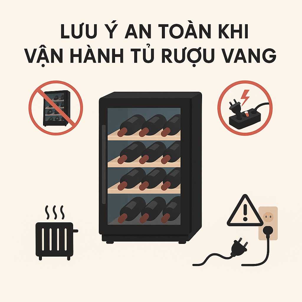 Tủ rượu vang là thiết bị làm lạnh hoạt động liên tục, do đó nhu cầu điện năng khá đáng kể, tương đương một chiếc tủ lạnh cỡ nhỏ. Để đảm bảo an toàn điện và tuổi thọ cho tủ, không nên cắm chung tủ rượu vang với quá nhiều thiết bị khác trên cùng một ổ điện, đặc biệt là các thiết bị công suất lớn. Một số điểm cần lưu ý: