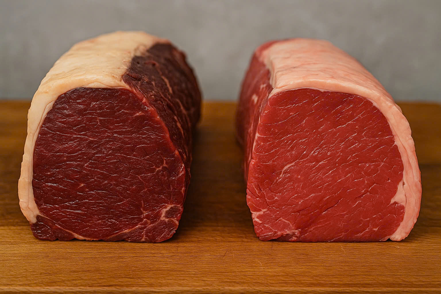 So sánh thịt bò ủ khô (bên trái) và thịt bò ủ ướt thông thường (bên phải). Sau khi ủ khô, thịt bò có màu đỏ sẫm hơn hẳn và các thớ thịt săn chắc, đậm mùi thơm “bùi”. Lưu ý lớp vỏ khô sẫm màu bên ngoài thịt ủ khô đã được cắt bỏ trước khi chế biến, bởi phần vỏ này rất khô cứng và không ăn được.