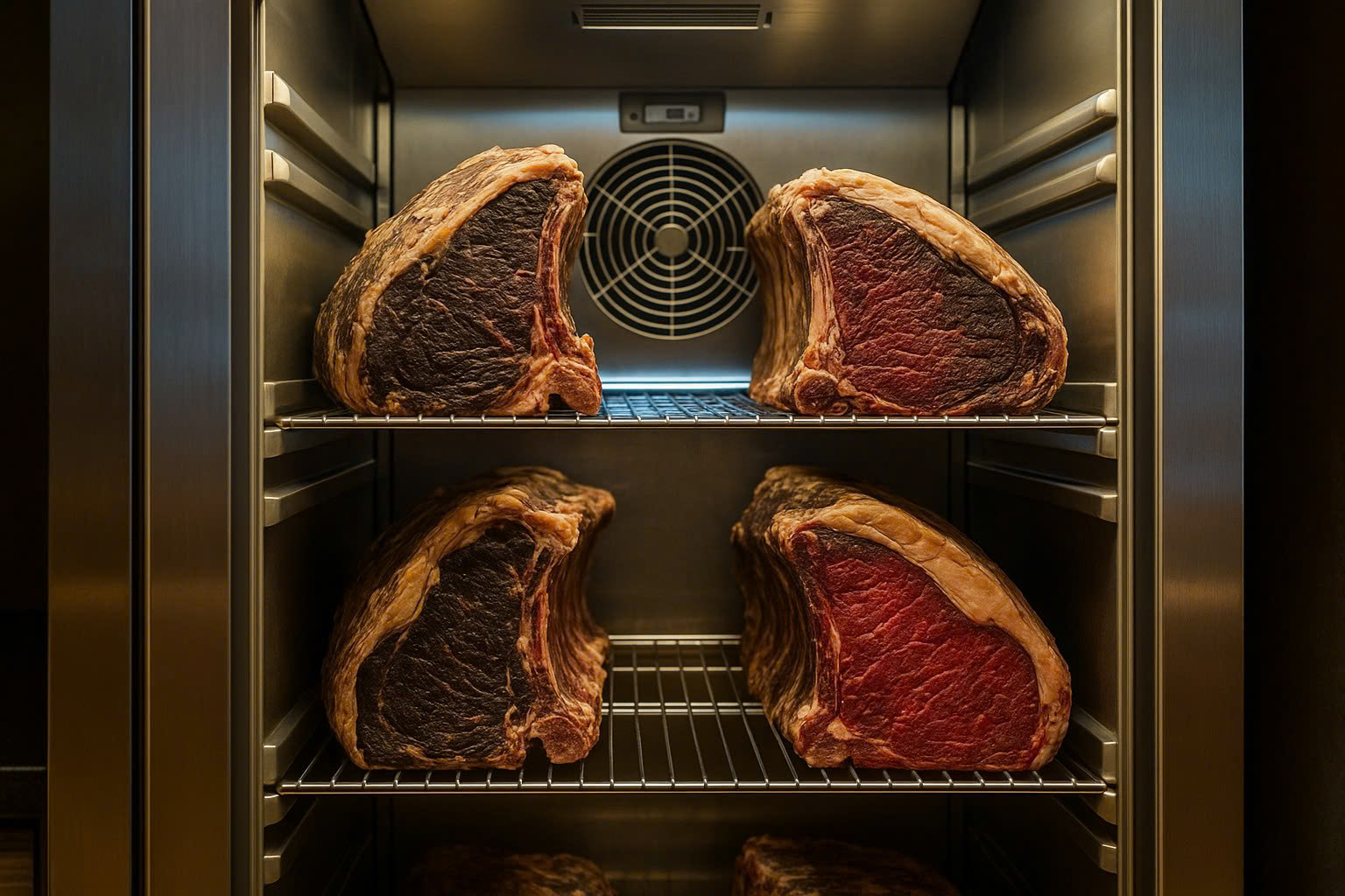 Một chiếc tủ ủ thịt chuyên dụng (dry-aging cabinet) với môi trường kiểm soát chặt chẽ: nhiệt độ duy trì khoảng 1–3°C, độ ẩm ~75–85%, kết hợp quạt gió tuần hoàn và đèn UV diệt khuẩn. Nhờ điều kiện lý tưởng này, miếng thịt được ủ an toàn trong nhiều tuần mà không hỏng, cho phép các enzym tự nhiên “làm mềm” thịt và tạo hương vị thơm ngon đặc trưng.