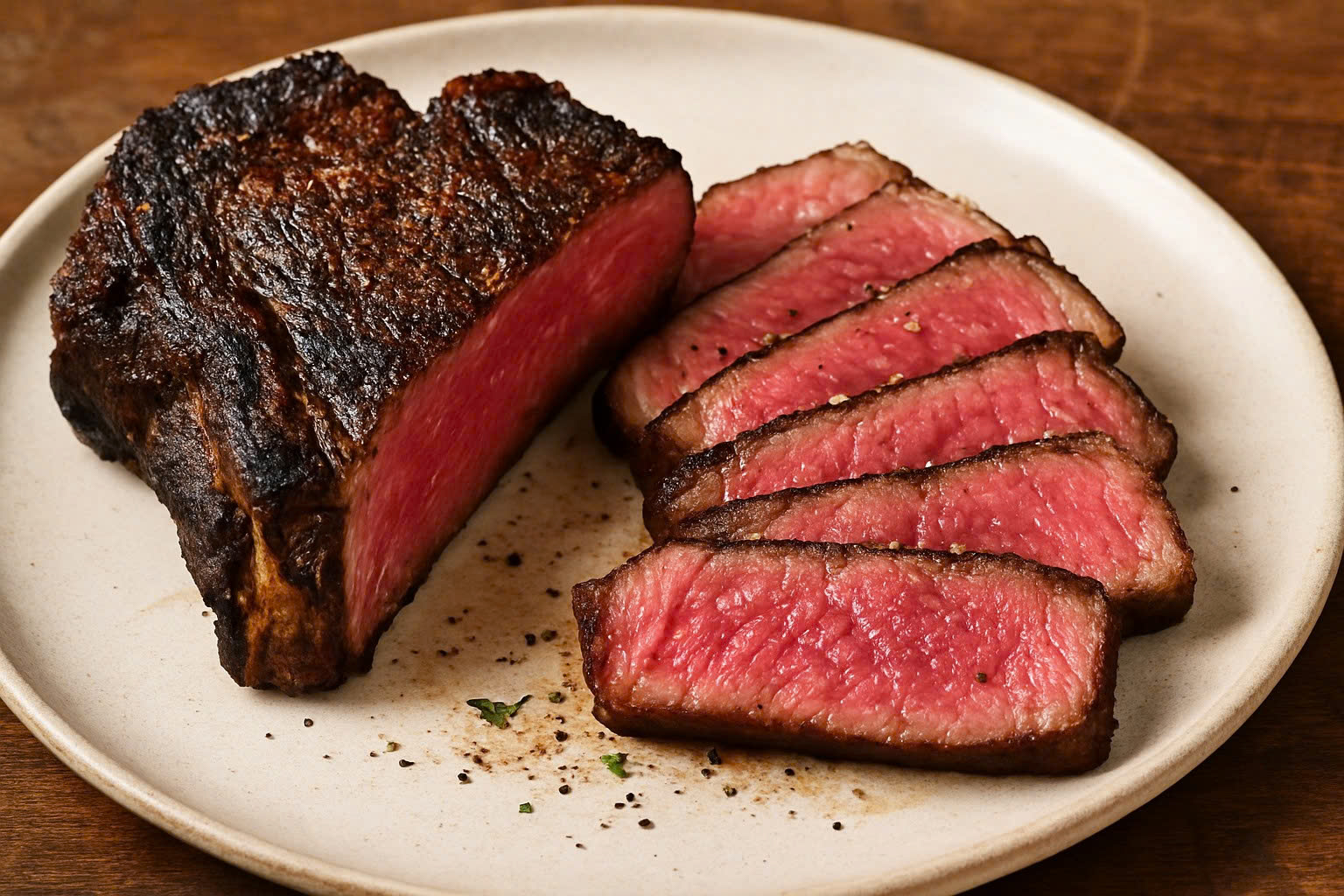 Thành phẩm beefsteak dry-aged thượng hạng sau khi chế biến. Miếng thịt ủ khô đạt chuẩn cho độ mềm tan như bơ, hương thơm ngào ngạt và vị umami đậm đà “ăn một lần là nhớ mãi”. Đây chính là phần thưởng xứng đáng cho sự kiên nhẫn và kỹ thuật ủ thịt công phu của bạn!