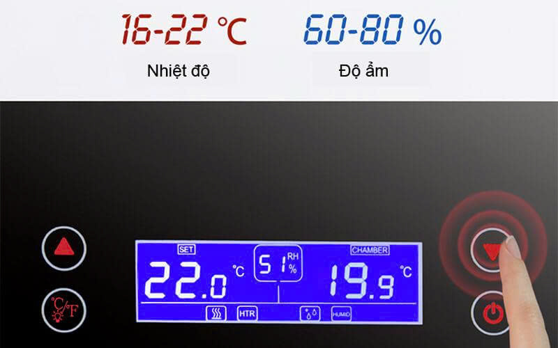 - Bảng điều khiển kỹ thuật số: Màn hình LED hiển thị nhiệt độ và độ ẩm theo thời gian thực, cho phép người dùng điều chỉnh nhanh chóng. Cảm biến độ ẩm có độ chính xác cao giúp kiểm soát môi trường ủ cigar ổn định.