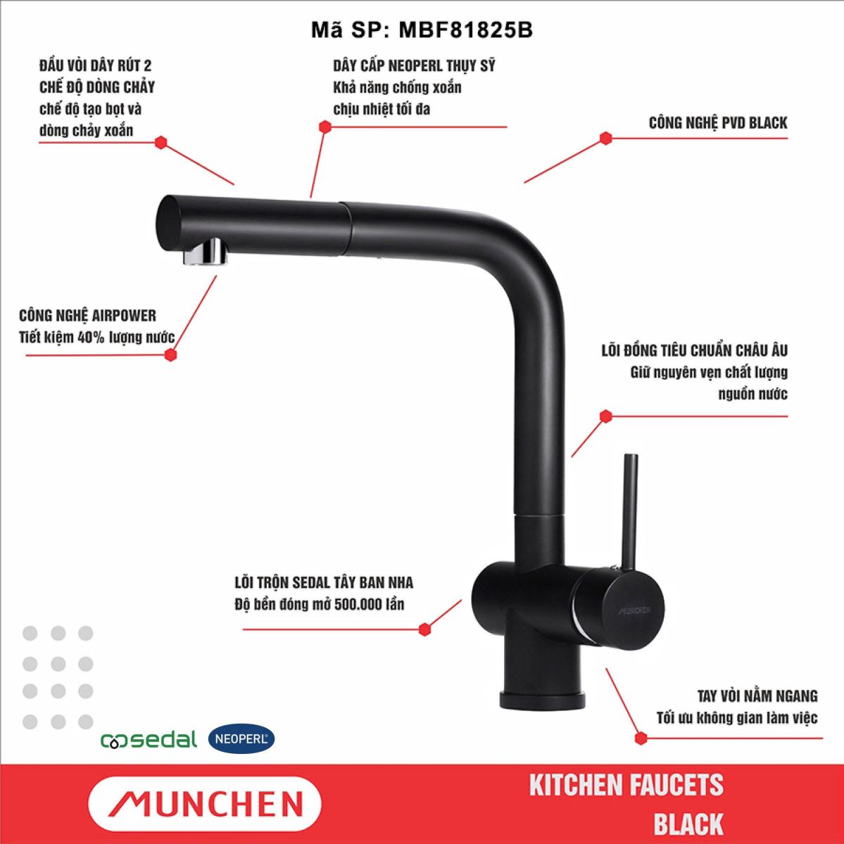 Với thiết kế sang trọng, chất lượng chuẩn châu Âu và hàng loạt tính năng tiện ích, Munchen Black MBF81825B xứng đáng là trợ thủ đắc lực trong mỗi căn bếp hiện đại. Sản phẩm không chỉ giúp công việc rửa dọn trở nên nhanh chóng, nhẹ nhàng hơn mà còn góp phần thể hiện phong cách tinh tế của gia chủ. Khi lựa chọn vòi rửa bát Munchen, bạn đang đầu tư cho sự tiện nghi và độ bền lâu dài của ngôi nhà mình.