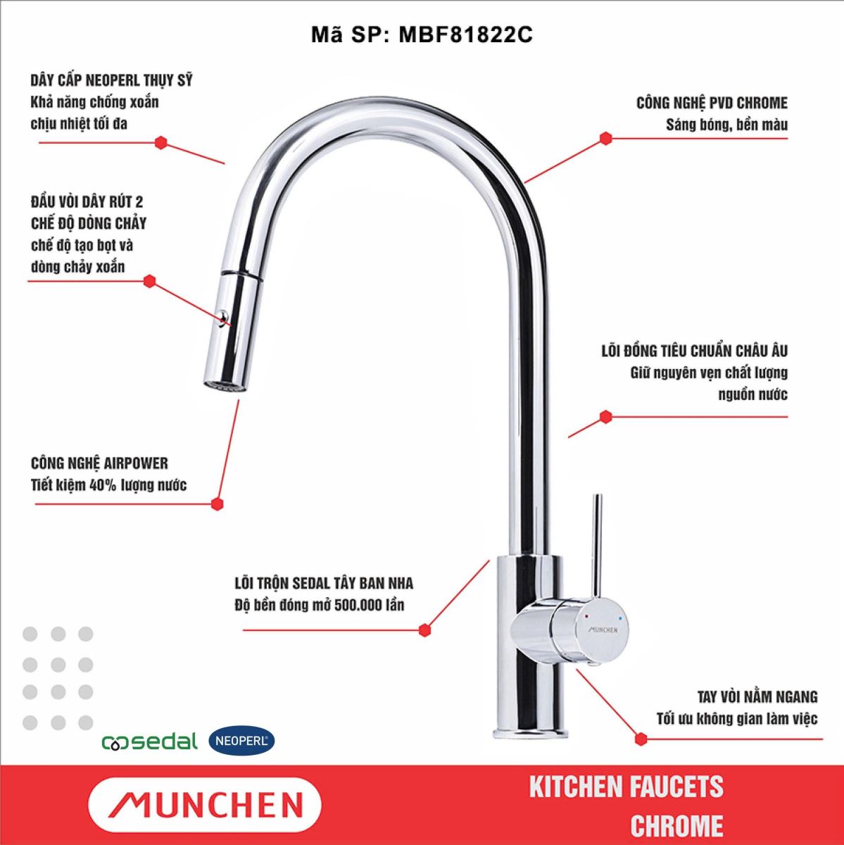 Vòi rửa bát dây rút Munchen Chrome MBF81822C – Sự lựa chọn hoàn hảo cho căn bếp hiện đại