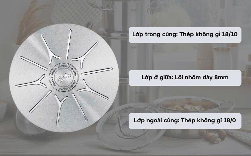 Fissler trang bị cho bộ nồi 70113 đáy Cookstar 3 lớp độc quyền. Cấu trúc này bao gồm lõi nhôm dày ở giữa để dẫn nhiệt nhanh, kẹp giữa hai lớp inox. Lớp trong cùng bằng inox 18/10 tiếp xúc trực tiếp với thực phẩm; lớp ngoài cùng bằng inox từ tính 18/0 tương thích với tất cả các loại bếp, kể cả bếp từ. Hoa văn hình sao Cookstar ở đáy giữ cho nồi luôn phẳng dù sử dụng lâu dài, tránh cong vênh và tối ưu hóa việc truyền nhiệt.